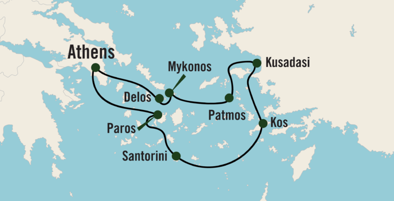 Set sail from Athens and head to the sacred island of Delos, followed by the lively Mykonos, where charming boutiques and sun-kissed beaches await. Continue to the serene Skala Harbor on the island of Patmos, a destination known for its spiritual significance and breathtaking landscapes. As you journey to the Turkish coastline, explore the ancient city of Kusadasi, where the ruins of Ephesus transport you back in time. Delight in the sun-soaked shores of Kos, Greece, with its crystal-clear waters and relaxed island vibes. Unwind in the iconic Santorini, where whitewashed houses cling to volcanic cliffs, and enjoy the stunning sunset views that the island is famous for. Discover the unspoiled beauty of Paros, with its traditional villages and beautiful beaches. Conclude your journey with cherished memories of the Mediterranean’s most alluring destinations, as you disembark in Athens, where modernity meets antiquity.