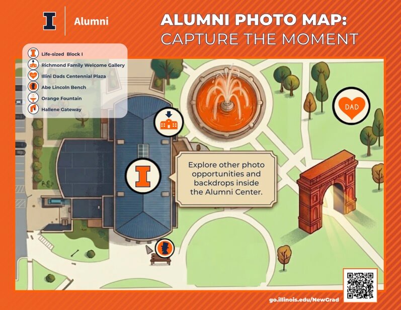 Use this Alumni Plaza Photo Map to find the best spots in and around the Alice Campbell Alumni Center for your graduation pics. From iconic backdrops to hidden gems, it’s all right here.